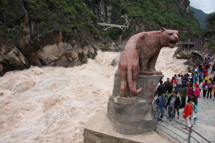 ●午餐之后出发前往有世界峡谷之称-【虎跳峡】,峡谷长16千米,南岸玉龙雪山主峰海拔5596米,北岸中甸雪山海拔5,396米,中间江流宽仅30-60米。虎跳峡的上峡口海拔1800米,下峡口海拔1630米,两岸山岭和江面相差2500-3000米,谷坡陡峭,蔚为壮观。江流在峡内连续下跌7个陡坎,落差170米,水势汹涌,声闻数里,为世界大峡谷之一。(温馨提示:虎跳峡是世界上大峡谷, 也是中国峡谷之一,以“险”而闻名天下,游览时请您注意安全)