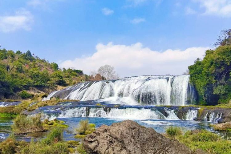之后乘坐观光车游览【陡坡塘瀑布】,是黄果树瀑布群中瀑顶宽的瀑布,瀑布形成百米多长的钙化滩坝上,在平水期,水流清澈,瀑布显得十分清秀妩媚,水层沿着和缓瀑面均匀的散开,在粼粼的钙化滩面上轻盈的舞动,如一层薄薄的半透明的面纱,又如一面面张开的素绢扇面在阳光下泛着银光。1986年版【西游记】片尾曲里面取景地。游览结束后乘车前往酒店,后自由活动。