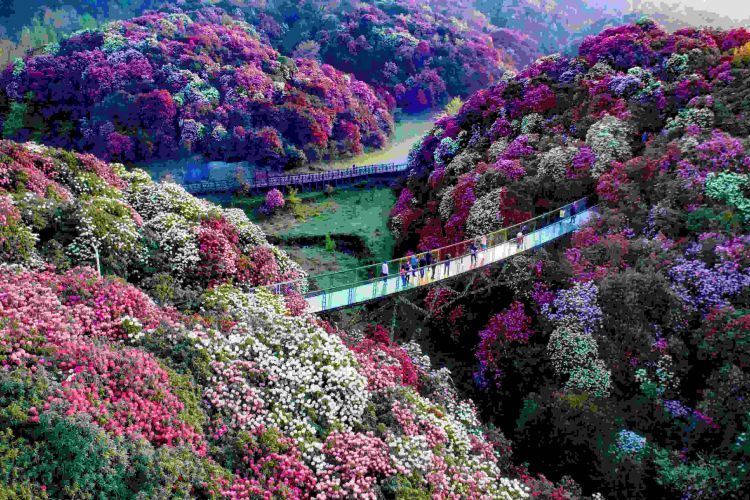 酒店早餐后乘车约2小时前往游览【百里杜鹃】(游览金坡景区)(游览时间约2小时左右)(如遇大雨大风等天气原因造成无花观赏不另作赔偿,望配合!),需换乘景区观光车(不含景区大摆渡车费用40元/人、金坡观光车35元/人、景区保险10元/人,必消景交敬请自理。);百里杜鹃林带延绵50余公里,宽约1~3公里,有马缨杜鹃、大白花杜鹃、水红杜鹃、露珠杜鹃等41个品种,占世界杜鹃花5个亚属中的全部,,为难得的是“一树不同花”,即一棵树上开出若干不同品种的花朵,,壮观的可达7种之多,花色多样,绚烂生辉。每年3—5月花期时节,百里杜鹃竞相开放,红、白、黄、紫,如火如荼,若云若霞,百里花山色彩缤纷,犹如广袤的锦缎华章铺山盖岭,被誉为“世界上,大的天然花园”。游览结束后乘车约2小时前往茅台/仁怀酒店入住。